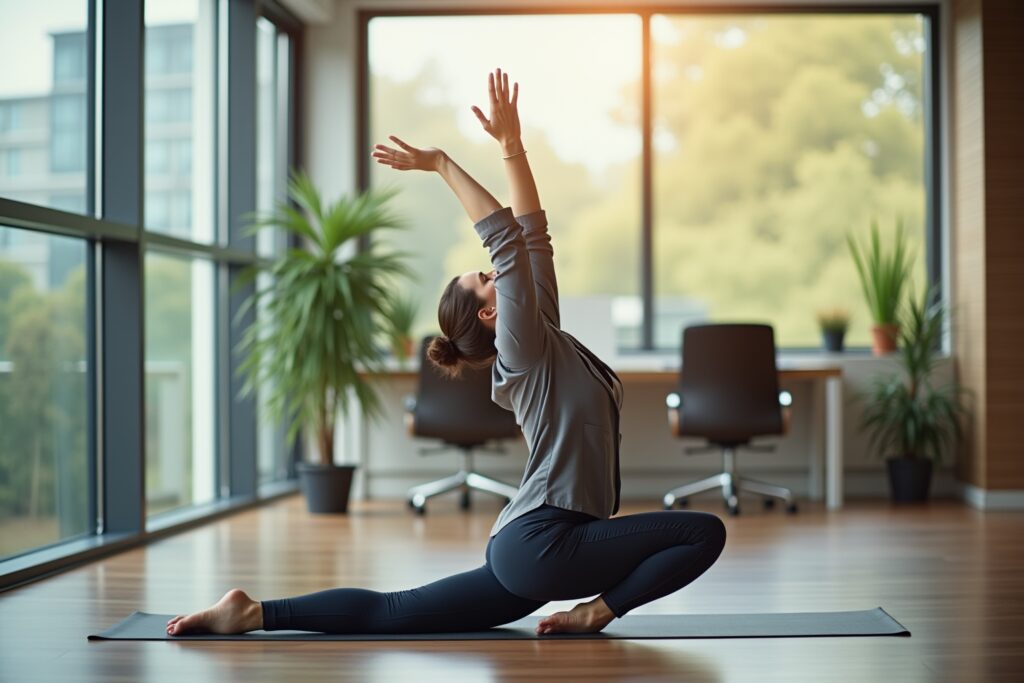 - Mittagspausen-Yoga: Nutze deine Mittagspause für einige ruhige Asanas oder eine kurze Meditation. Dies kann dir helfen, den Arbeitsstress abzubauen und neue Energie zu tanken.
